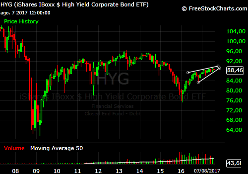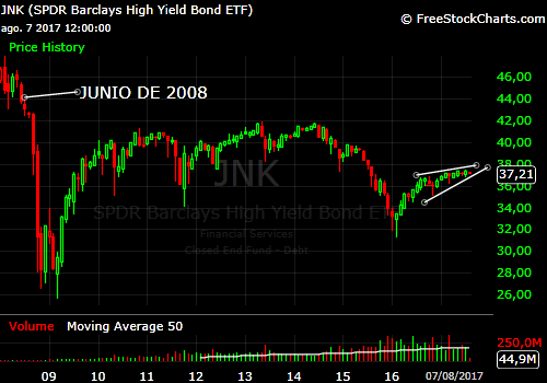 Nos encontramos en un momento en que los rendimientos de la deuda también cotizan en mínimos, los de la deuda de baja calificación -High Yield- y la deuda basura -Junk- han caído fuerte desde los máximos de la crisis. Inversamente, los precios de ambos han recuperado gran parte del terreno perdido durante la purga de 2008-2009 pero sin alcanzar los máximos de entonces.