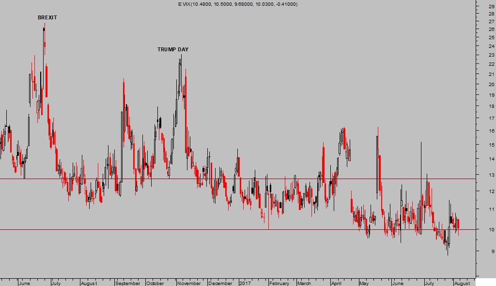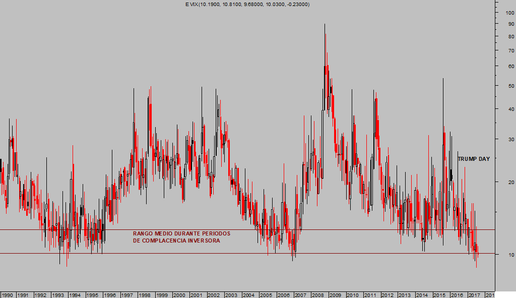 En las últimas 6.000 sesiones de contratación de la bolsa americana, contados desde principios de los años ´90, el índice de volatilidad implícita del S&P500, conocido como VIX, ha cerrado por debajo de 10 sólo 26 veces, un 0.4% del total.