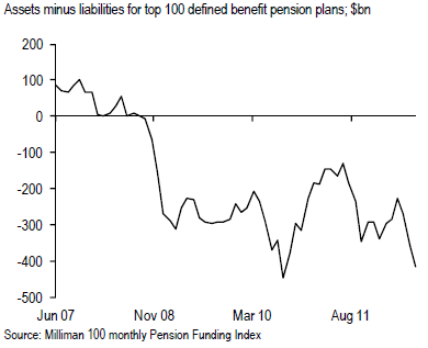 Como consecuencia, el balance patrimonial de los fondos de pensiones USA presenta un déficit cercano al medio Billón de dólares, tal como recoge el cuadro a continuación de los 100 principales fondos: