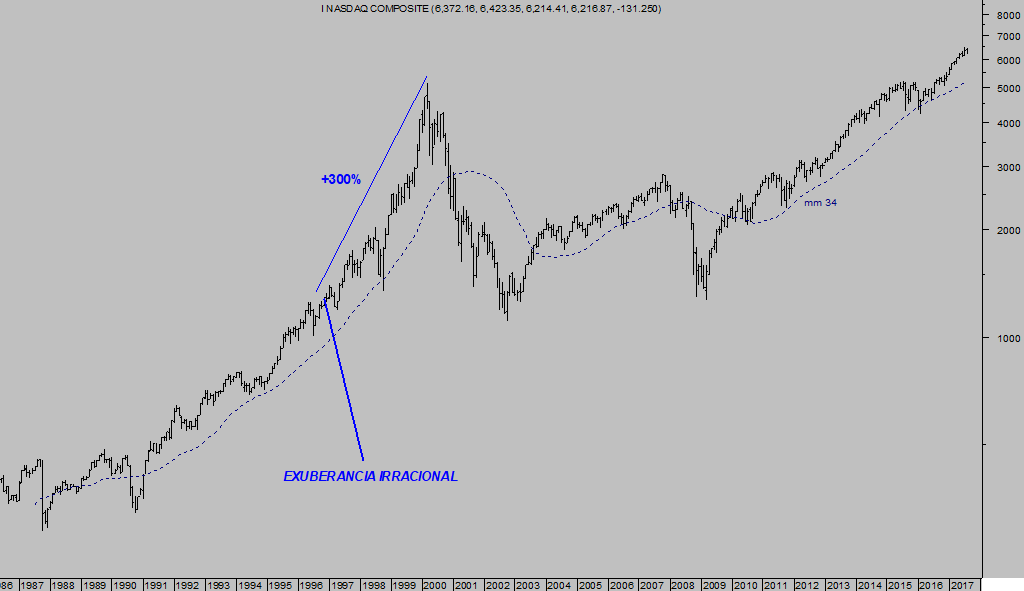El índice que realmente brilló en bolsa fue el tecnológico, a principios de 1997 emprendió una carrera al alza que terminó siendo superior al 300% y una de las burbuja más potente de la historia, la mayor desde 1929, superando ampliamente cualquier métrica de valoración racional y cualquiera registrada con anterioridad.