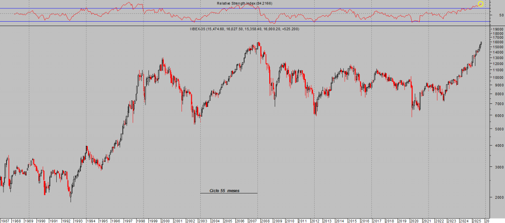 Su imagen técnica de largo plazo muestra un potente rally en los últimos tres años que ha generado una rentabilidad del +120%, gran sobrecompra y proximidad a una fecha de ciclo de largo plazo que en el pasado se ha demostrado relevante.
