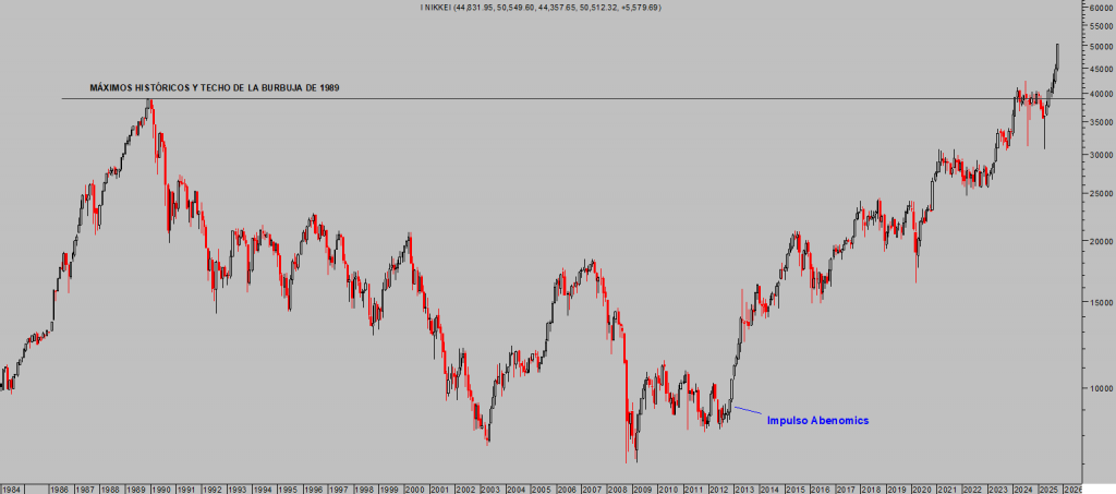 Después el Nikkei, un índice que registró su último máximo histórico en 1989 antes del pinchazo de su burbuja doble, financiera e inmobiliaria.