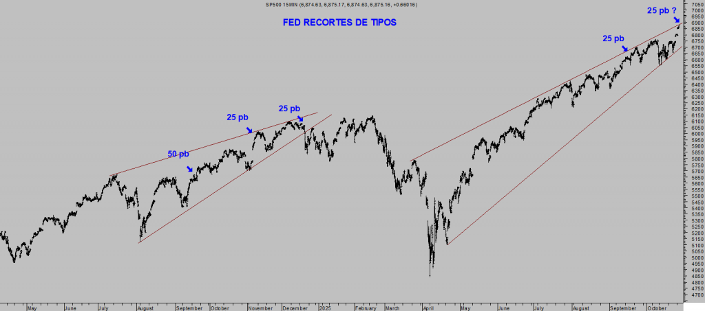 Las bolsas siguen de fiesta, ayer nuevas alzas y nuevos máximos históricos con los inversores descontando una resolución positiva del encuentro Trump-Xi Jinping para sus relaciones comerciales (es más probable el anuncio de una nueva tregua), un recorte de tipos de la FED mañana, buenos resultados de las grandes tecnológicas que presentan esta semana, etc…