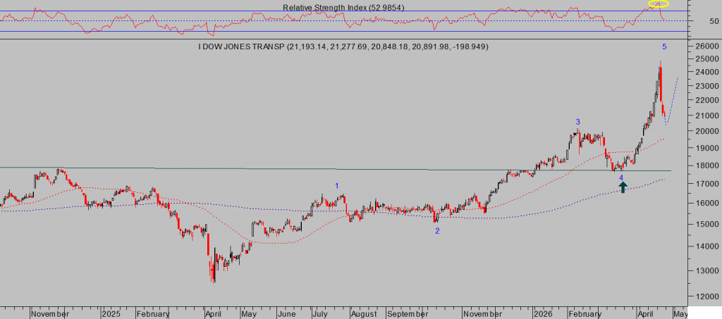 El Dow Jones de Transportes, después de subir casi un 40% en pocas semanas (rally advertido antes de comenzar en la fecha señalada con la flecha en verde del gráfico siguiente) continuó desplegando su violenta pauta correctiva en la jornada del viernes, tal como anticipamos el día anterior, ha caído cerca del 20% en sólo 3 sesiones y se aproxima a zonas técnicas de interés que deberían frenar el desplome y dar lugar a un próximo repunte.