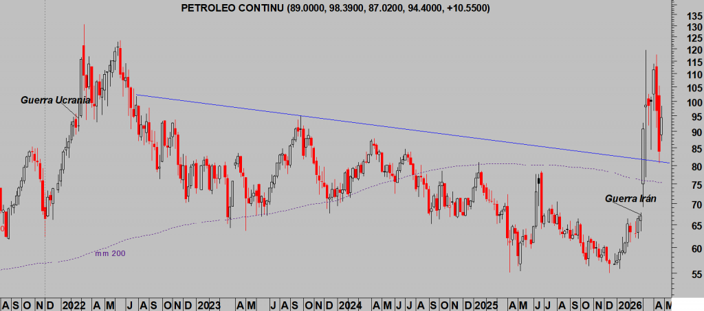 Eventualmente, si el precio del crudo sigue al alza y rebasa las referencias técnicas señaladas en post del viernes las bolsas sufrirán y viceversa si el West Texas desciende hacia el entorno de los $80-85 por barril.