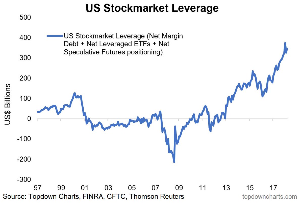 Cuanto más altas las lecturas de apalancamiento, más violentas y nerviosas las correcciones de mercado ya que cuando el mercado cae es obligado aportar garantías adicionales para mantener posiciones apalancadas abiertas y muchos inversores optan por venta «por lo mejor» para evitar lo peor.