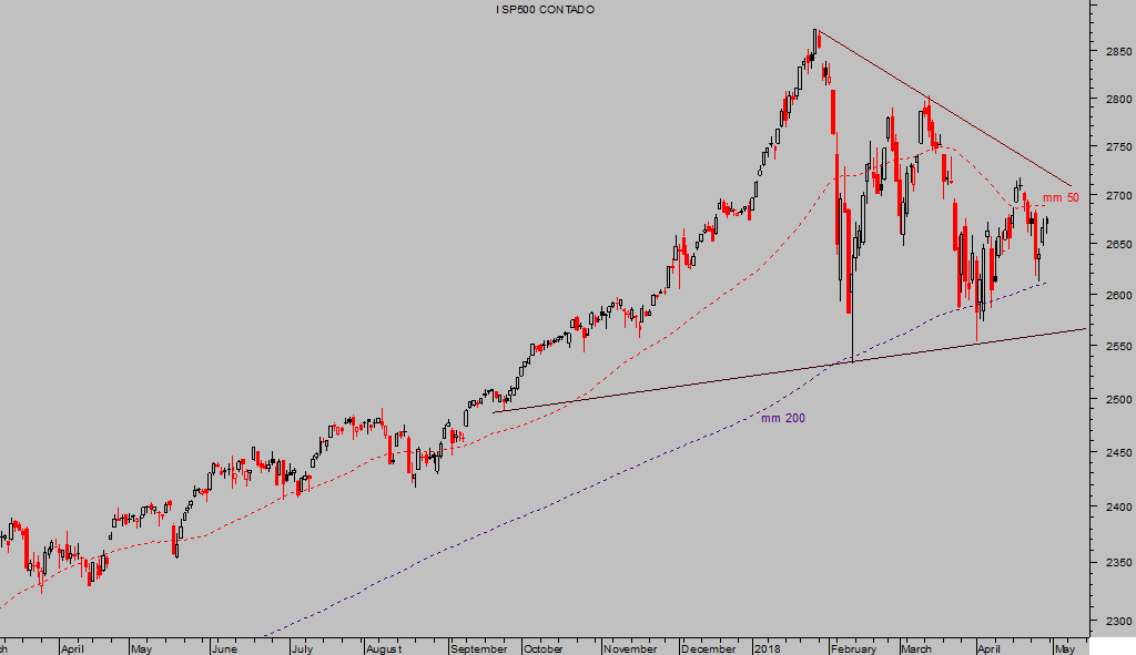 El aspecto técnico general de los índices USA es controvertido, con lecturas mixtas posibles y un abanico de alternativas interesante. El mes de abril se está comportando de acuerdo con lo esperado y a menos que hoy, última sesión del mes, se deslice fuertemente a la baja, muy improbable, finalizará con los índices bursátiles al alza.