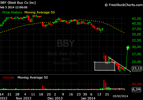 El escrito del 20 de enero, mostraba cautela ante la fuerte caída del precio de Best Buy, señalando en el gráfico la caja negra o zona de caídas objetivo más probable. Además indicaba «El mismo viernes el valor cayó otro 8% y Best Buy cerró en $24.43, plena zona objetivo. A pesar de lo cual, no conviene entrar comprando directamente, preferible esperar hasta observar un escenario técnico de corto favorable.»