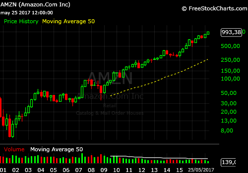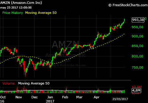 Amazon ha sido, junto con Apple, Facebok o Microsoft uno de los valores que más ha subido y arrastrado del índice al alza, ayer prácticamente alcanzó los $1.000 por acción en un estado técnico de sobre compra muy acusada, divergencias severas y evidente pérdida de momentum.