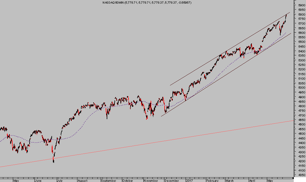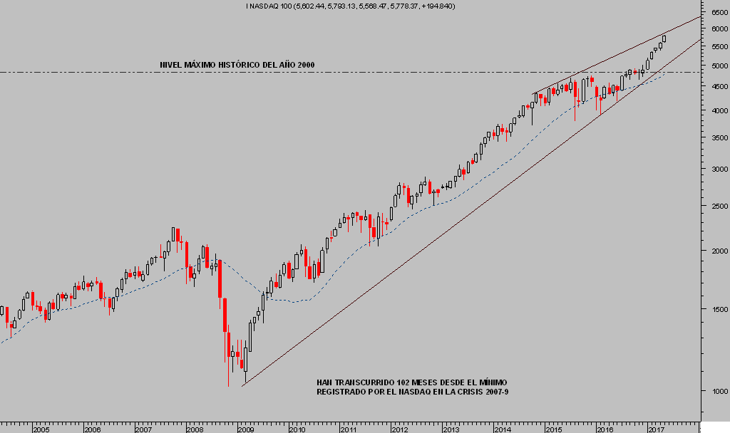 El Nasdaq cumple 102 meses desde que registrase mínimos de la crisis 2007-9, gracias a la euforia de bienvenida al presidente Trump el rally se ha intensificado, superando los máximos históricos del año 2000 y presenta la siguiente imagen técnica.