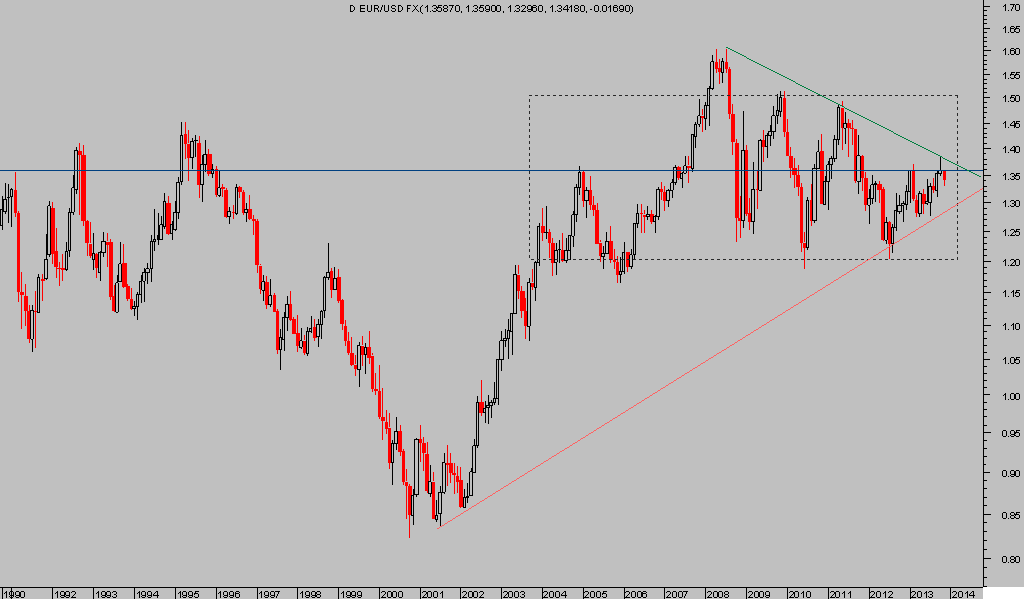 En plazos más largos, el cambio Euro-Dólar no presenta apenas novedades desde hace 10 años, en que ha desplegado un movimiento lateral en un amplio rango delimitado por las áreas 1.20 y 1.50.
