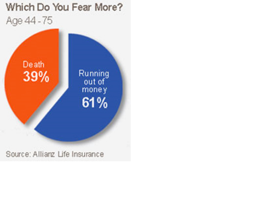 Una encuesta elaborada por Allianz Life Insurance, a gente entre 44 y 75 años, pregunta qué temen más, si quedarse sin dinero o morir. La respuesta es desoladora, el 61% temen más quedarse sin dinero y sólo un 39% teme morir. Muy triste situación.