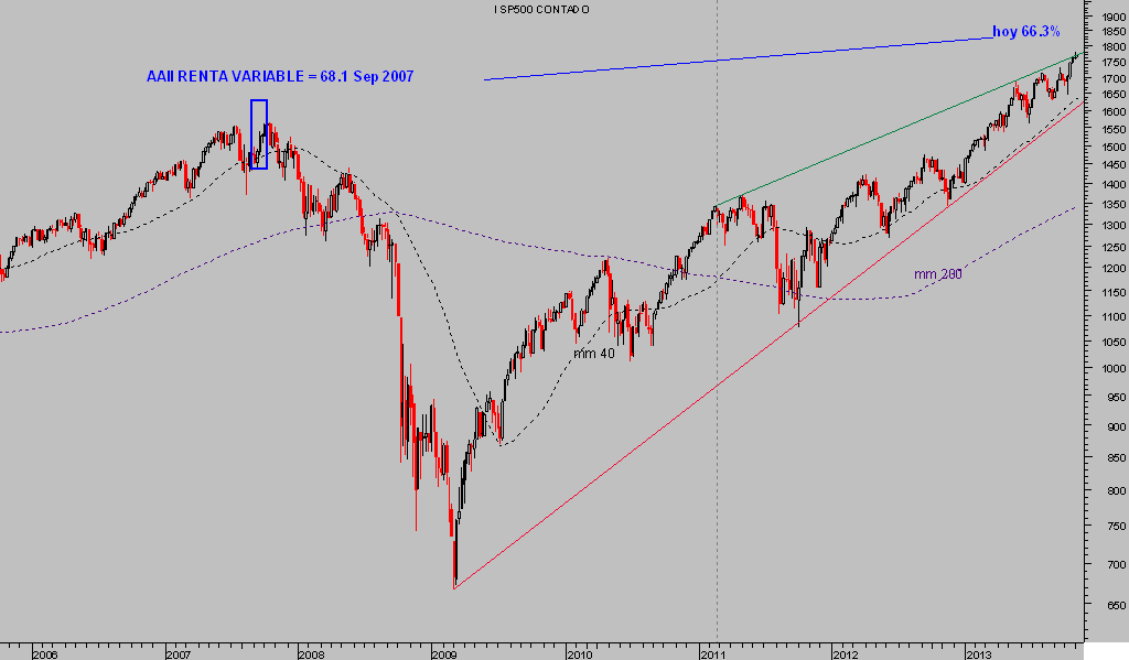 Volviendo al mercado, tiende a provocar bruscos bandazos para desestabilizar a la mayoría y cambiarles el paso, tal como se observa en los gráficos anteriores. Cuando en el pasado las lecturas de ponderación de cartera fueron tan elevadas como hoy, la bolsa cayó. Por contra, cuando eran tan pobre en Renta Fija como hoy, los bonos subieron a continuación.