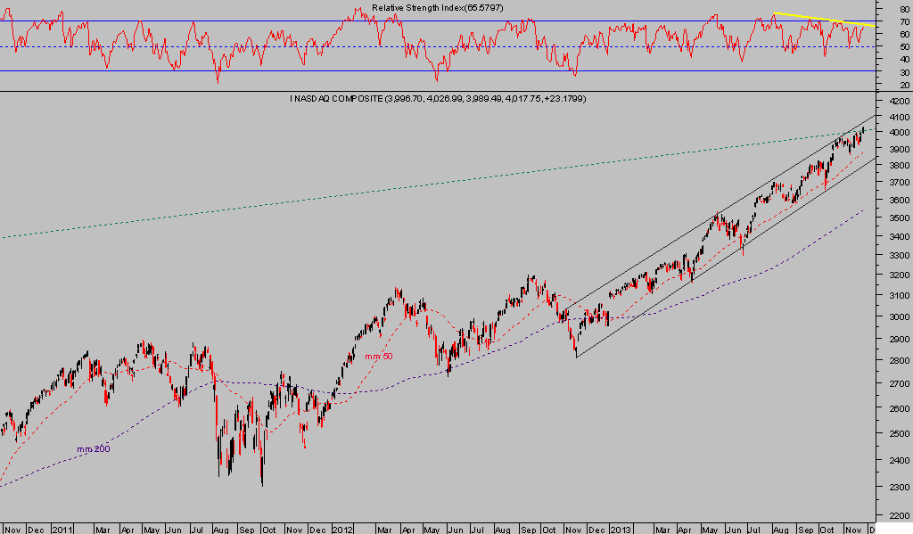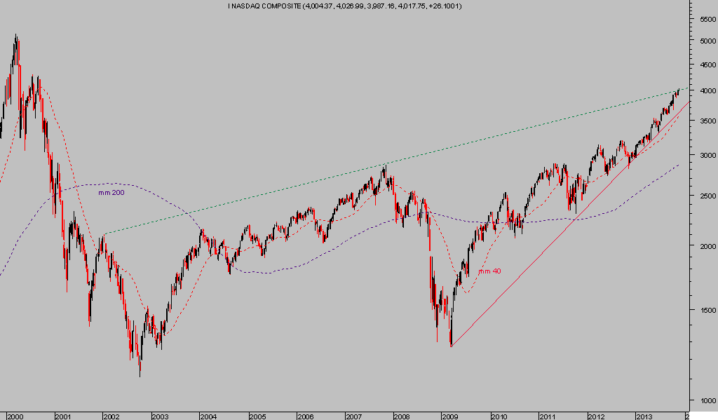 De igual manera que la radiografía del SP500 en 1.800, o el Dow Jones en 16.000, el Nasdaq Composite ronda la zona de los 4000 puntos, todos niveles redondos y tradicionalmente considerados psicológicos que suelen conformar resistencia por sí solos, todos coinciden en la falta de confirmación en el asalto a sus respectivas zonas de resistencia tras un año estelar con subidas incluso superiores al 30%.