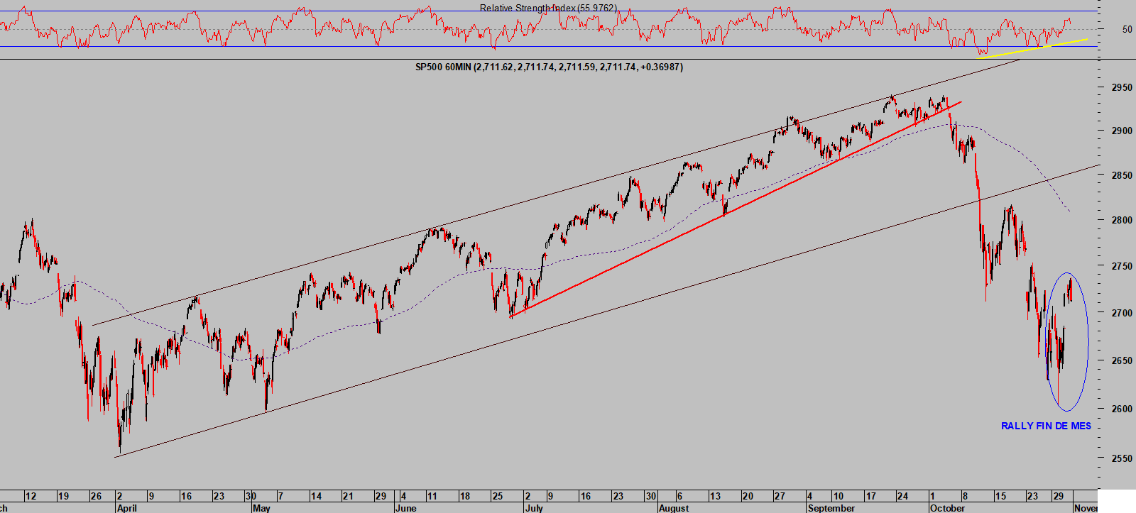 La recta final del mes en las bolsas, después de un octubre rojo y nefasto, ha sido positiva y alcista en la mayoría de los índices bursátiles globales aunque los cierres mensuales arrojan saldos muy negativos. El S&P500 ha perdido en octubre un -6.9% después de haber conseguido recuperar un 3% en las últimas dos sesiones.