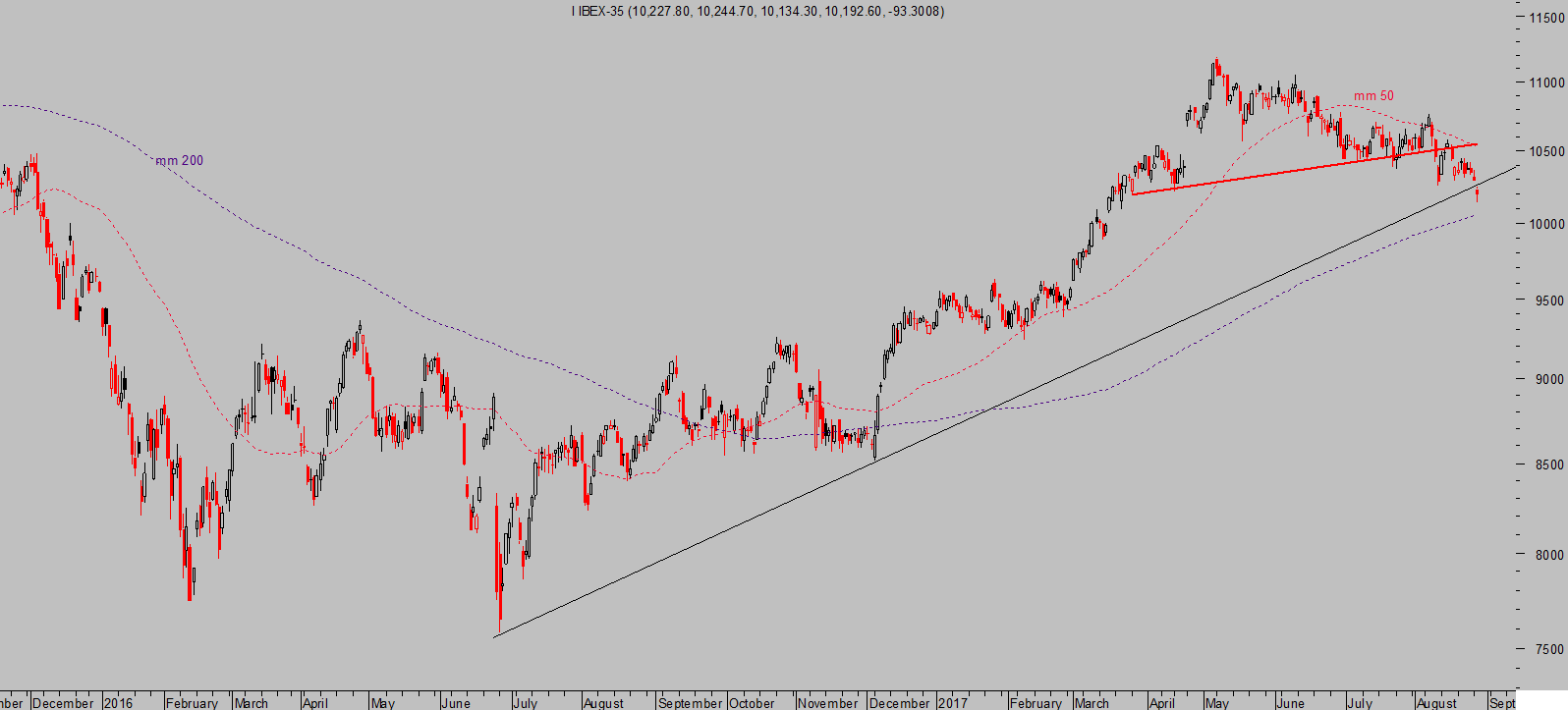 El IBEX continúa desarrollando la corrección iniciada desde los máximos del pasado día 8 de mayo, un proceso sin visos de haber concluido y cuya continuidad es el escenario aún más probable tras la ruptura de referencias técnicas de la sesión de ayer.