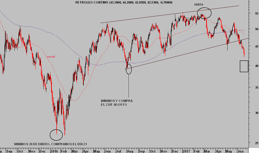 Ayer el crudo volvió a caer, dejándose algo más del 2, tras comentarios de expertos y algún informe (explorado en post de ayer) de grandes casas de análisis descubriendo 4 meses después del techo de febrero, que el crudo está corrigiendo y además caerá hacia la zona de los $30 por barril.