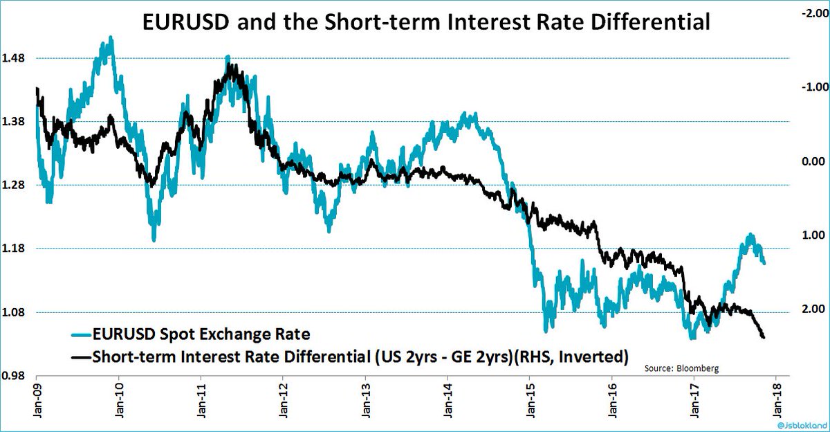 Además de las lecturas técnicas -de pauta, indicadores y osciladores-, el diferencial de tipos USA, EU favorece alzas del Dólar, vean gráfico comparativo: