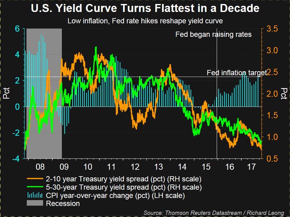La curva de tipos USA se ha aplanado hasta el extremo, desde que la FED iniciase el proceso de subida de tipos en diciembre de 2015, y la imagen es idéntica a la presente antes de la crisis de 2007-2009.