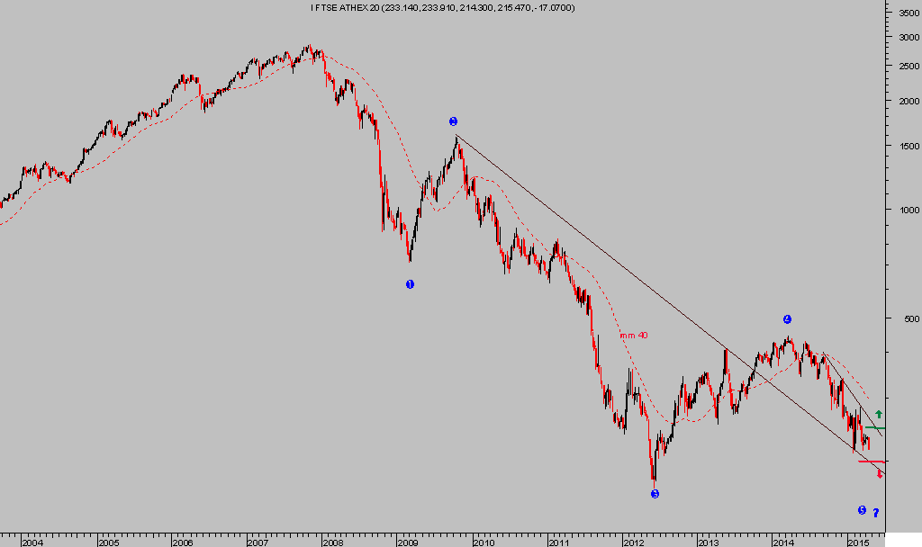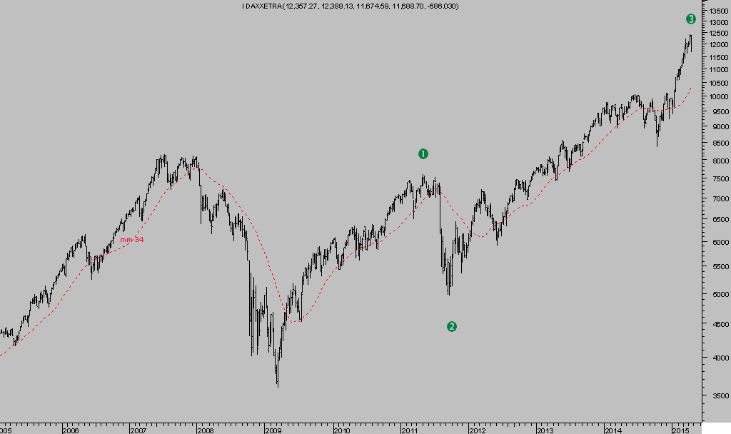 Sin embargo, los mercados han anticipado la situación subiendo y especialmente el alemán, que en zona de máximos históricos, presenta una imagen y recuento de Onda (siempre subjetivo) similar pero inverso al de la bolsa griega,