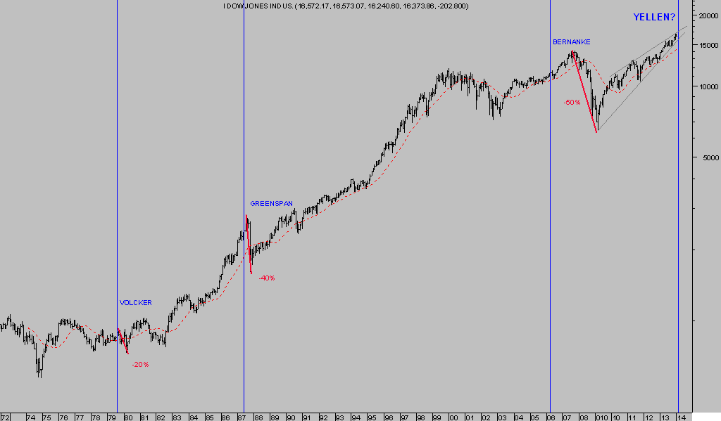 Sólo restan quince días para el final de la presidencia del Sr. Bernanke y ceda las riendas de la FED a Janet Yellen. Veamos el comportamiento de la bolsa -Dow jones- en distintos cambios de presidente de la FED, desde 1979, (gráfico actualizado del post del 28 de octubre)