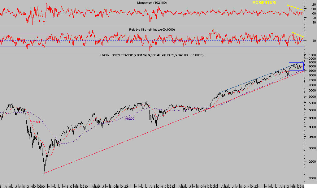 Situación interesante, a vigilar bajo la perspectiva de la clásica Teoría de DOW, según la cual, los máximos deben ser alcanzados y secundados por los distintos índices Dow (Industriales, Transportes y Utilities) para dar solidez al mercado y rupturas. De otra forma, las divergencias obligan a desconfiar de la fortaleza interna del movimiento.