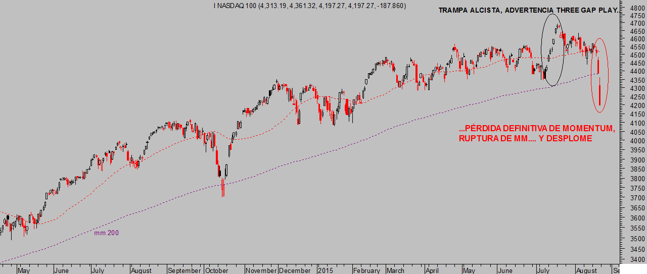 Las perdidas del Nasdaq en las últimas dos sesiones han sido aún mayores, no se producían desde las fatídicas sesiones de marzo de 2008 y han dañado significativamente el aspecto técnico, aunque no han sorprendido en absoluto a quienes tuvieron la ocasión de observar una huella técnica azarosa (three gap play) y otros acontecimientos técnicos explicados, vean gráfico:
