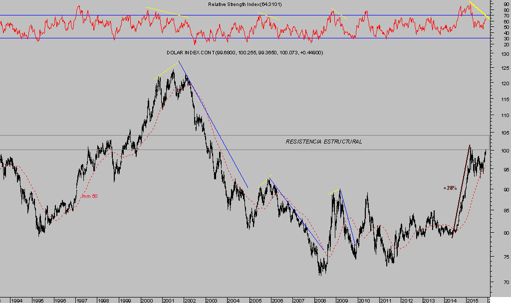 La fortaleza del Dólar es otro de los factores desinflacionistas y desestabilizador de las finanzas globales… y la FED pretende subir tipos o normalizar, lo que en principio produciría subidas adicionales en su cotización.
