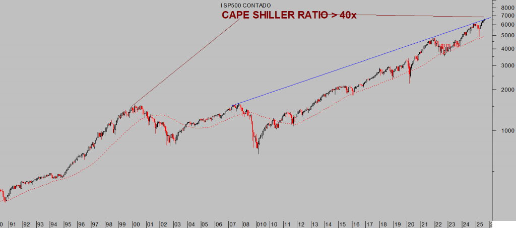 Sólo dos veces en la historia se ha disparado el ratio CAPE Shiller superando el nivel 40x, la primera fue registrada en diciembre de 1999 (alcanzó 44x) y la segunda se ha registrado la semana pasada en 40.15x.