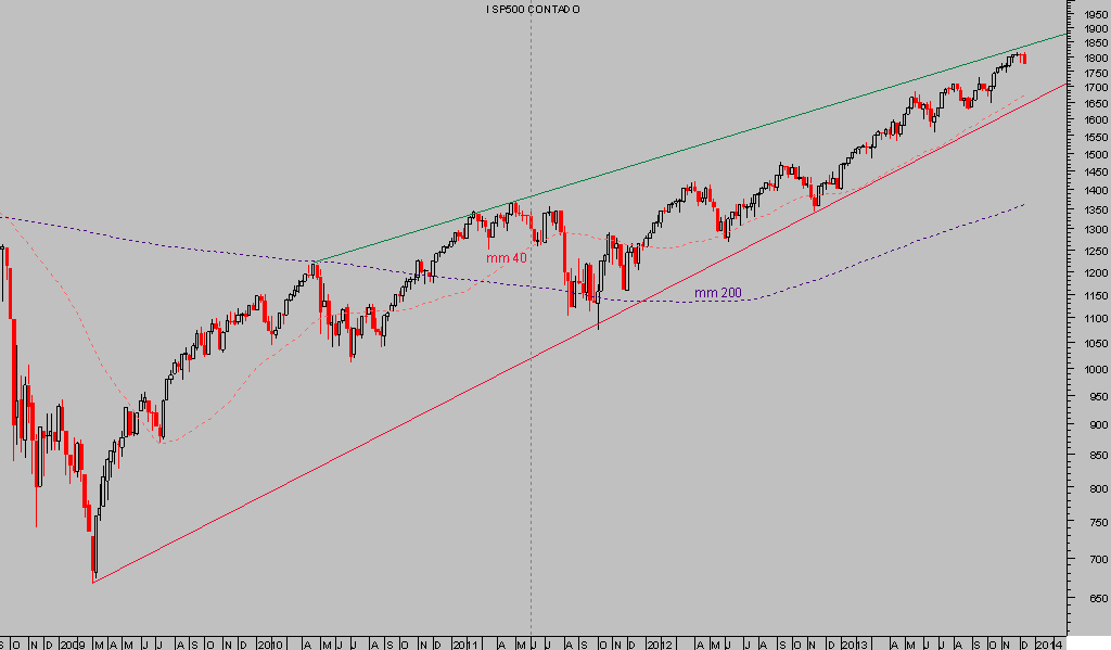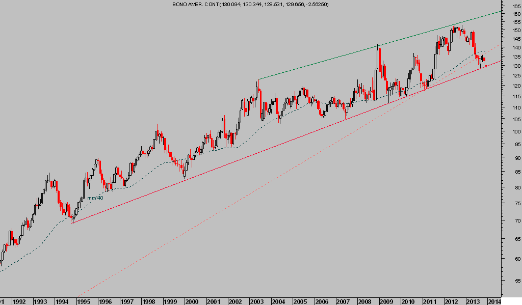 Desde principios de noviembre se agudizaron las ventas y caídas de precio y está ahora está, de nuevo,en peligro de romper esa directriz de largo plazo antes comentada con origen en 1994 -trazo rojo continuo-. Si la FED reduce el ritmo del QE (del que hoy $45.000 millones al mes van dirigidos a comprar bonos) o insinúa un pronto TAPER, la probabilidad de ruptura de esta última directriz será muy elevada, casi una certeza!