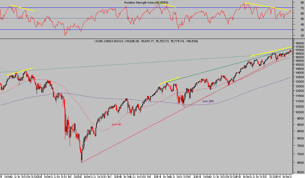 El aspecto divergente que muestra el Dow Jones es llamativo y de igual manera que en periodos pasados como 2.007 ó 2.011, anuncia tormentas.