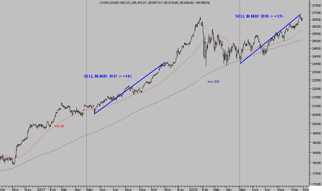 La próxima semana comienza el mes de octubre, considerado peligroso para los mercados por coincidir con grandes batacazos, mes que, por otra parte, finaliza con la estacionalidad negativa del año, comprendida entre los meses de mayo a octubre y este año, hasta la fecha, ha contrariado a los seguidores del aforismo «sell in may and go away», de igual manera que el año pasado.