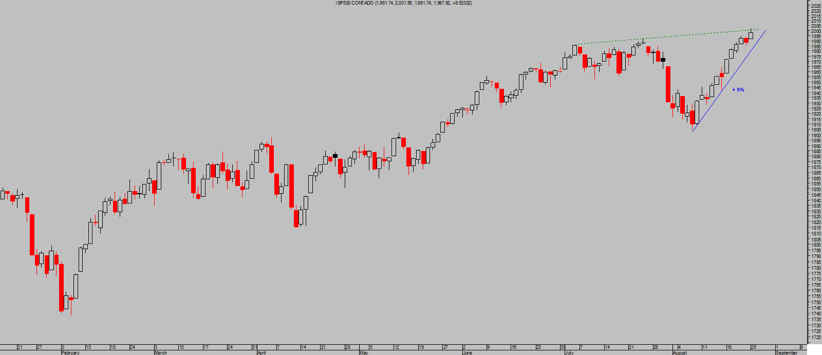 La sesión de ayer, primera tras el encuentro en Jackson Hole, sirvió de excusa a los inversores para aupar al SP500 al alza y situarlo por primera vez en su historia el nivel de los 2.000 puntos.