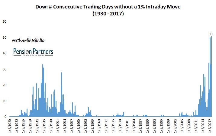 El Dow Jones acaba de superarse, con 51 sesiones consecutivas de volatilidad arrestada y desplazamientos intradiarios inferiores al 1%.