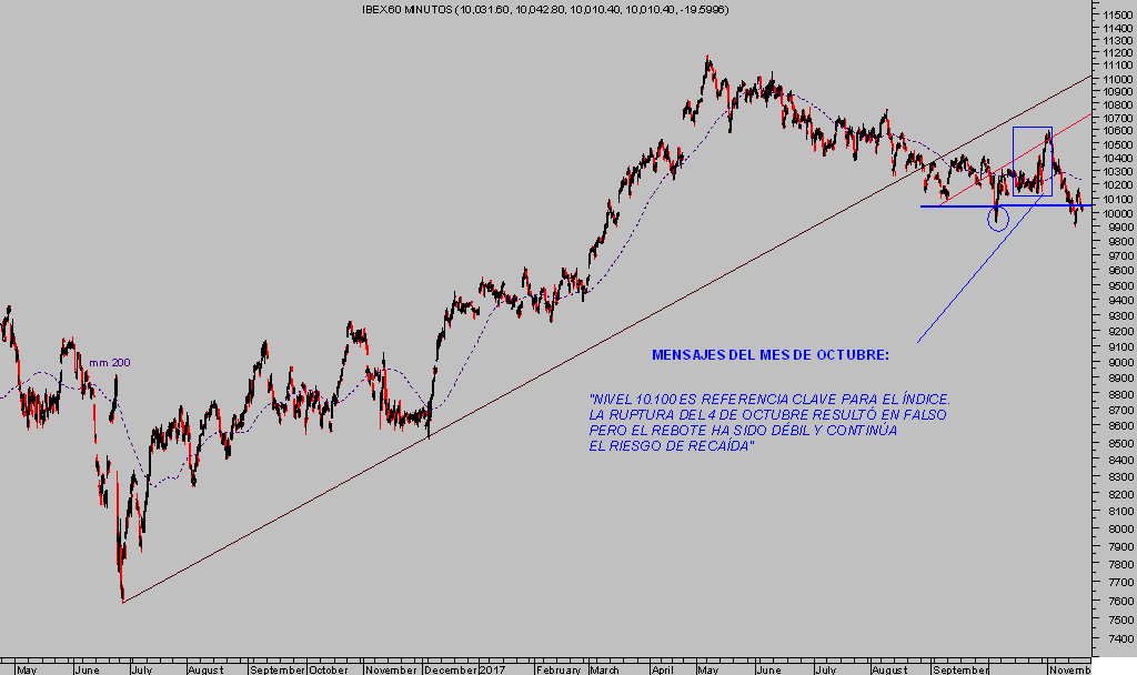 En España, el IBEX atraviesa una fase de debilidad marcada iniciada desde los máximos del pasado mes de mayo, un periodo correctivo técnicamente muy errático y con las usuales rupturas en falso que tanto confunden a los inversores centrados en plazos demasiado cortos.