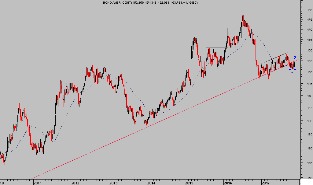 El aspecto técnico del T-BOND es estructuralmente delicado, como se aprecia en el gráfico anterior, pero aún no definitivo para apostar por caídas decididas desde los niveles actuales.