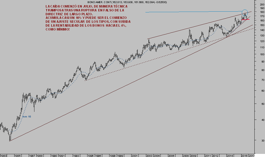 Visto lo anterior, el mayor de los peligros y uno de los más vaticinados por los analistas bajo la hipótesis de victoria de Trump ha sido la amenaza de un mercado bajista severo en el mercado de bonos durante 2017.