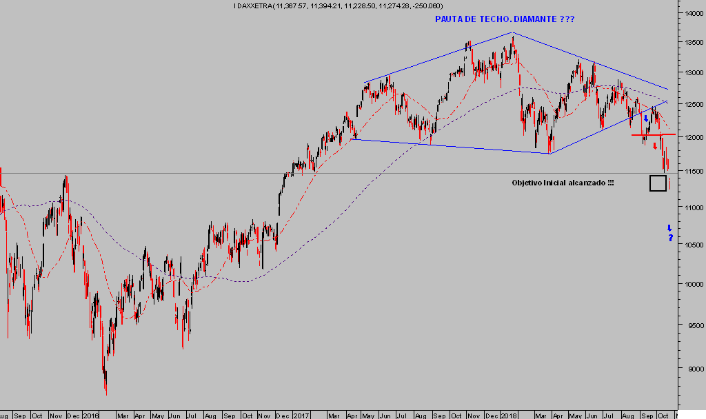 Las lecturas técnicas del mercado español, también del alemán, se han deteriorado muy significativamente en las últimas semanas y las cotizaciones han alcanzado niveles objetivo iniciales con los que venimos trabajando desde el pasado verano, cuando comenzamos a desvelar la formación de una peligrosa formación o pauta de techo de largo plazo en el DAX, denominada Diamante… «no apto para cardiacos».