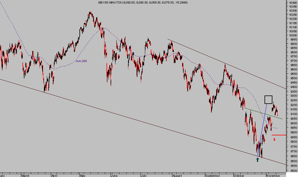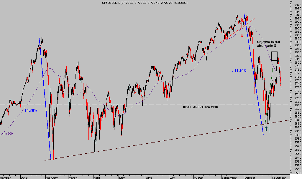 La recuperación iniciada desde los mínimos de octubre avanza muy en línea con expectativas, algunos índices han alcanzado sus zonas establecidas entonces como objetivo inicial o cajas negras señaladas en los gráficos siguientes.