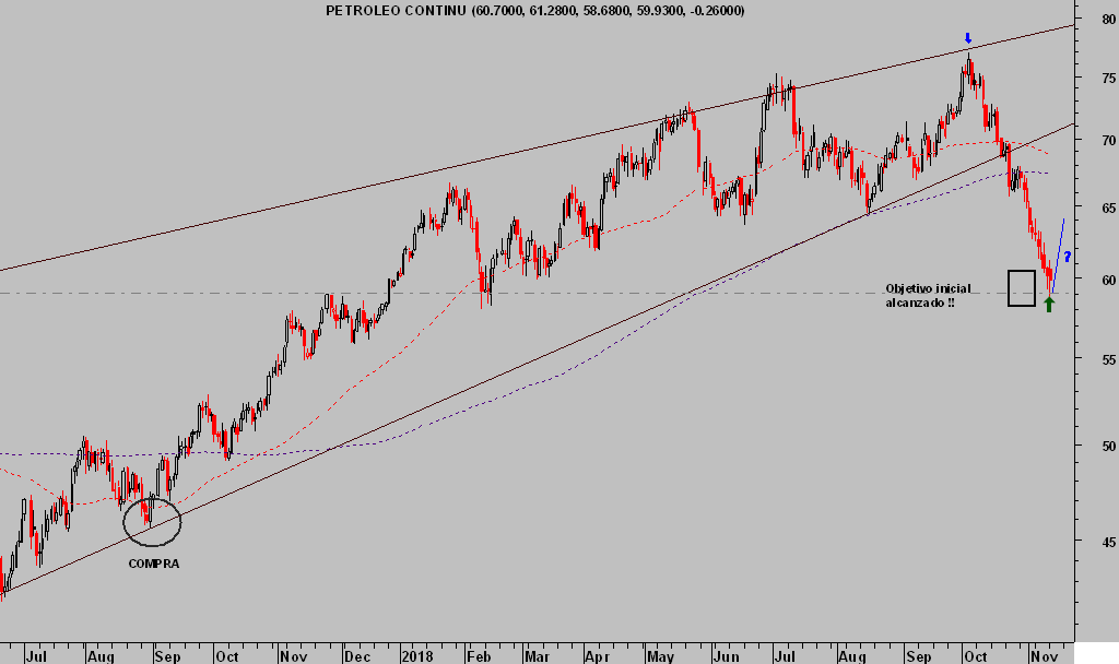 El crudo ha perdido un 24% desde sus máximos alcanzando la zona de objetivo inicial -caja negra del gráfico- que venimos señalando desde hace semanas. ¿Rebote técnico?.