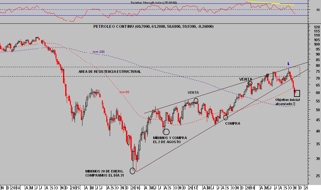 Después de hacerse pública la noticia, el precio del West Texas inició un rebote desde los mínimos de 59.4 hasta 61 dólares por barril. Se trata de unas declaraciones de apoyo al precio que junto con el análisis técnico y del fuerte descenso de posiciones alcistas -COT- señalan elevada probabilidad de que el suelo o final del actual tramo de caídas ha quedado registrado en los mínimos del viernes y podemos esperar un rebote hacia el entorno de los 66 dólares por barril, mínimo.